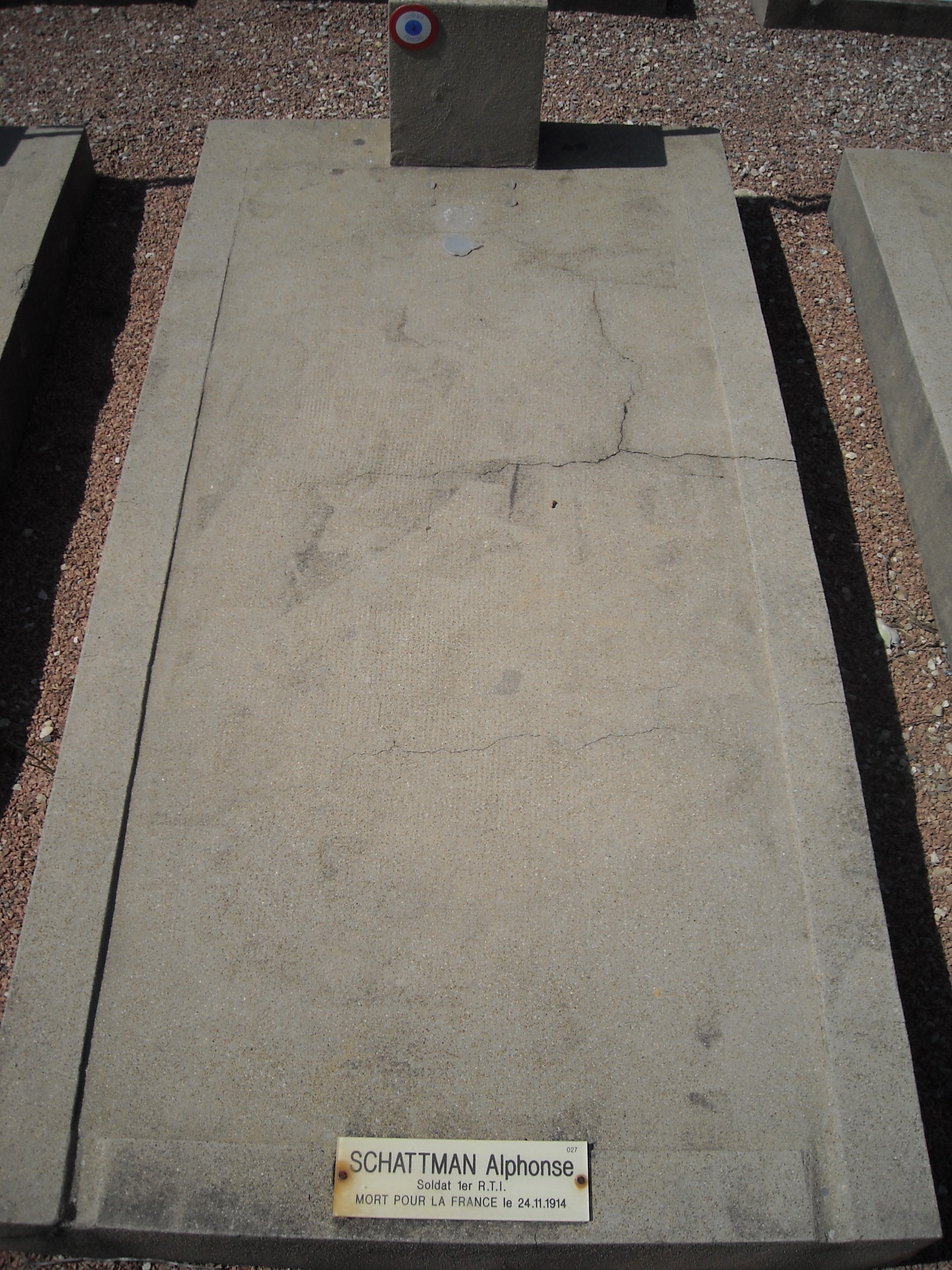 La plaque de sa tombe au Carré Militaire de Romans, Drôme, porte l’inscription “Schattman Alphonse, Soldat 1er R.T.I., 24.11.1914”.