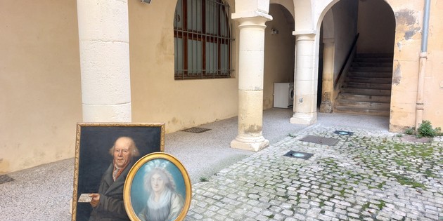 Du portrait de Claude-Étienne Nugues, une huile sur toile, nous ne savons que ce qui en est écrit au dos : “Portrait peint à Romans en décembre 1813 par Molinari”, probablement un peintre local. Dans la main gauche, il tient un billet sur lequel est écrit : “À Monsieur Nugues, négoçiant à Romans”. Du portrait de Charlotte Enfantin, un pastel, nous trouvons trace dans une correspondance avec son époux, lors d’un voyage qu’elle fit dans sa famille, à Paris, en 1796. Le 13 juin, elle écrit : “Hier, un peintre nous fut présenté et fait faire nos portraits.” Puis le 17 juin : “Le mien n’est pas entièrement fini mais il est ressemblant d’après l’aveu de tous ceux qui l’ont vu.” Ces deux tableaux ont été vendus en décembre 2019 à l’Hôtel Drouot de Paris.