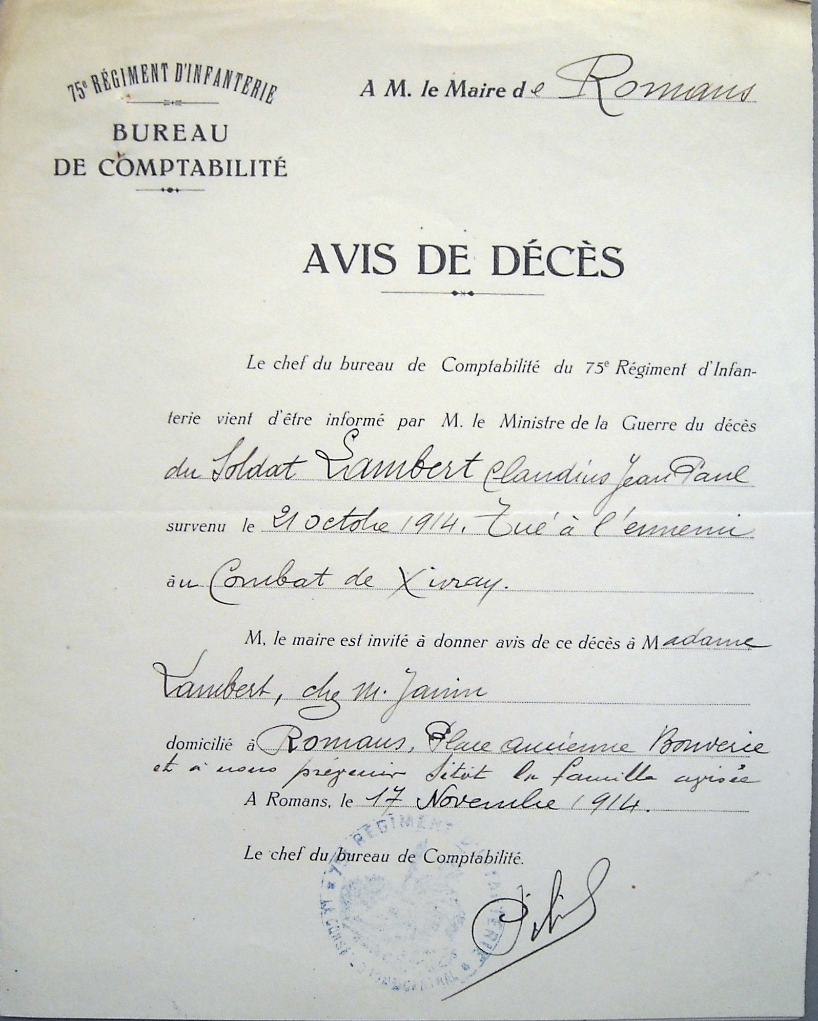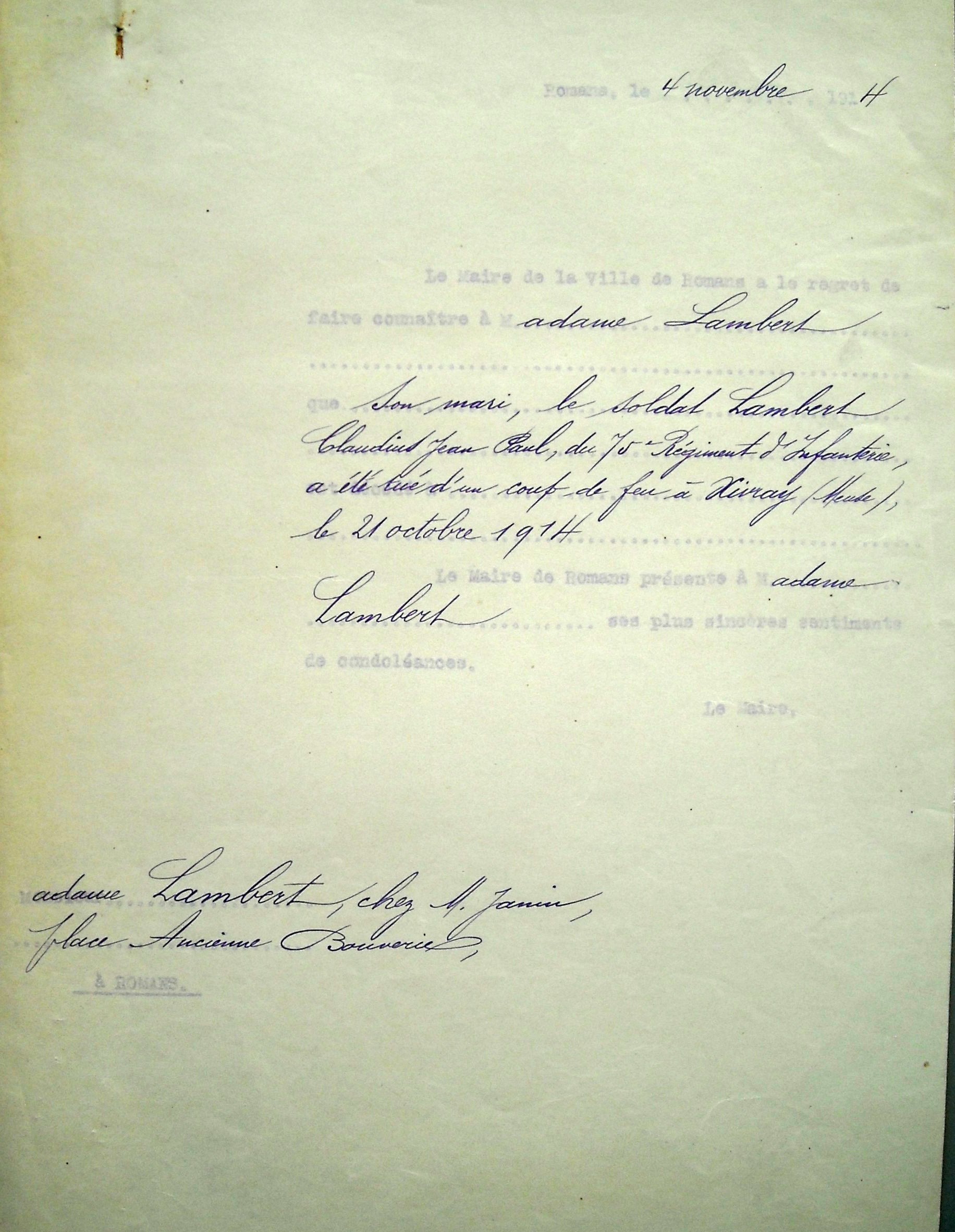 L’avis de décès a été envoyé le 2 novembre 1914 à Mme Lambert, son épouse, domiciliée chez Mme Janin, place ancienne Bouverie à Romans, Drôme. Le décès a été inscrit sur les registres de décès de Romans, Drôme : transcription 1915/54 du 16 juillet 1915.