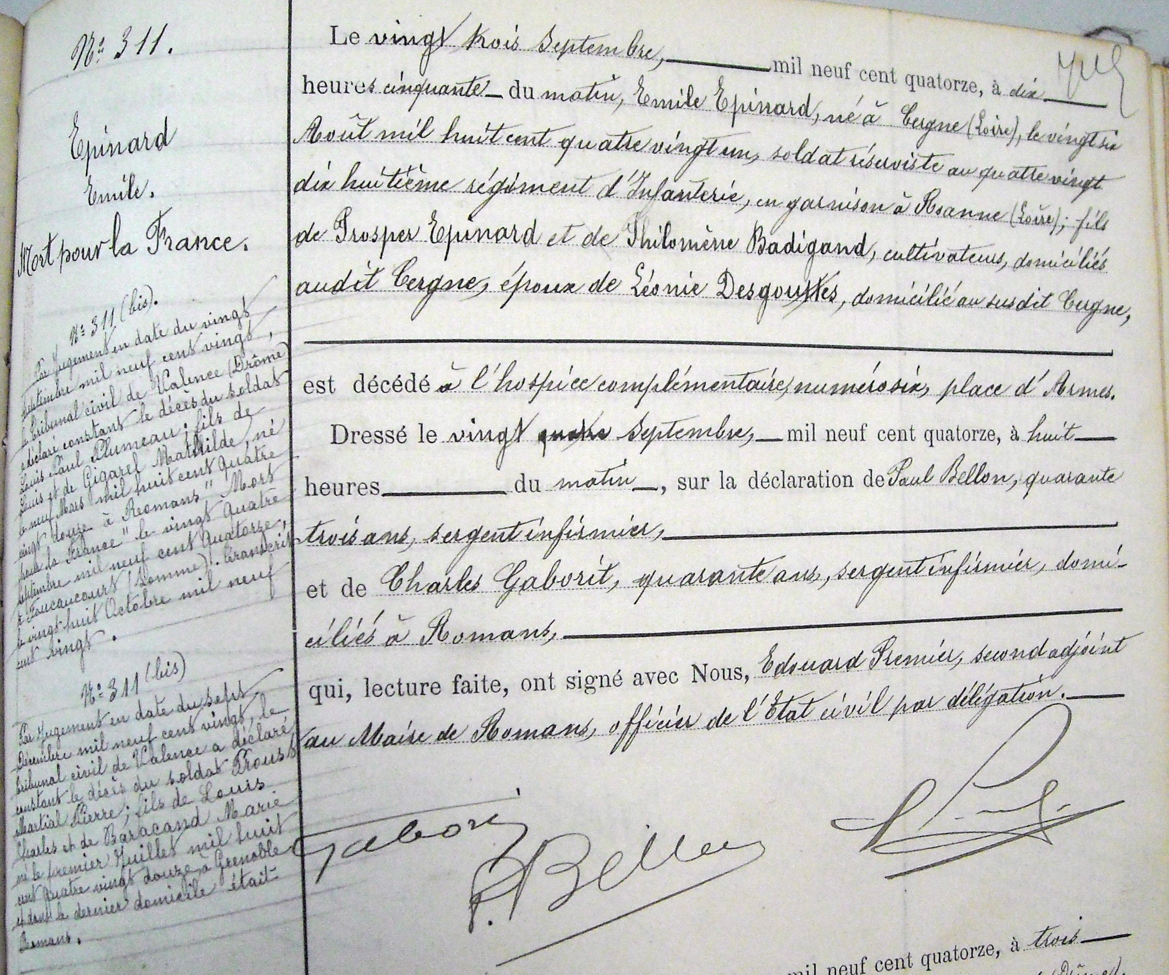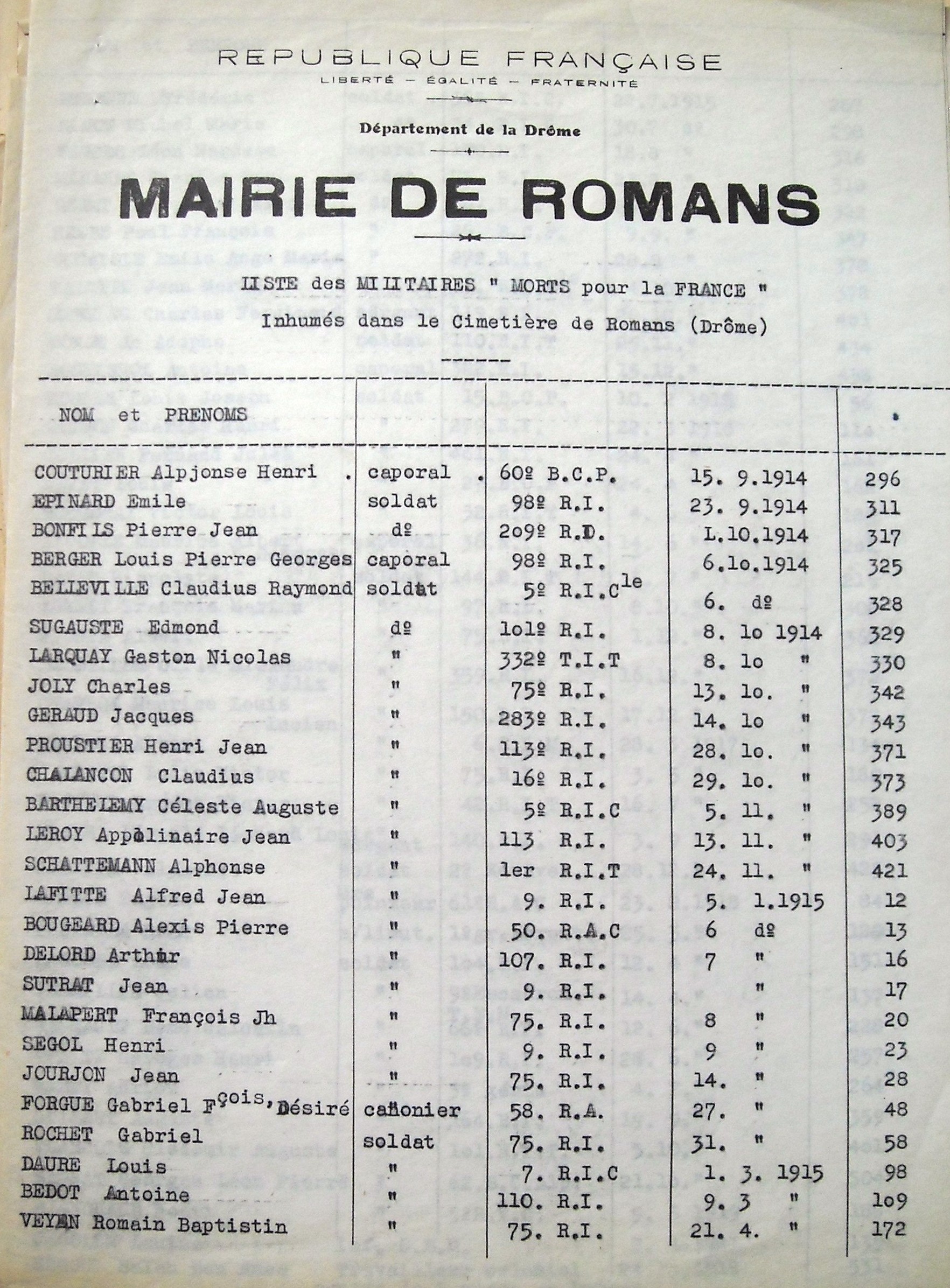 Le décès a été inscrit sur les registres de décès de Romans, Drôme : acte de décès 1914/311 du 24 septembre 1914.