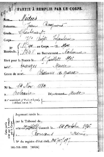 - Jean Raymond Médus, Mort pour la France le 15 juillet 1916