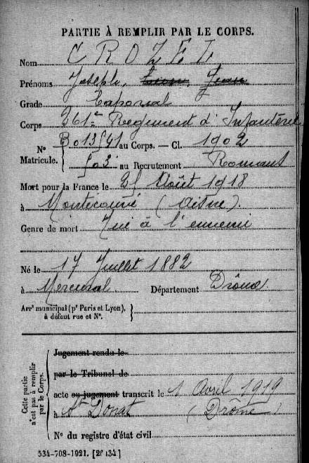 - Joseph Jean Crozel, Mort pour la France le 25 août 1918