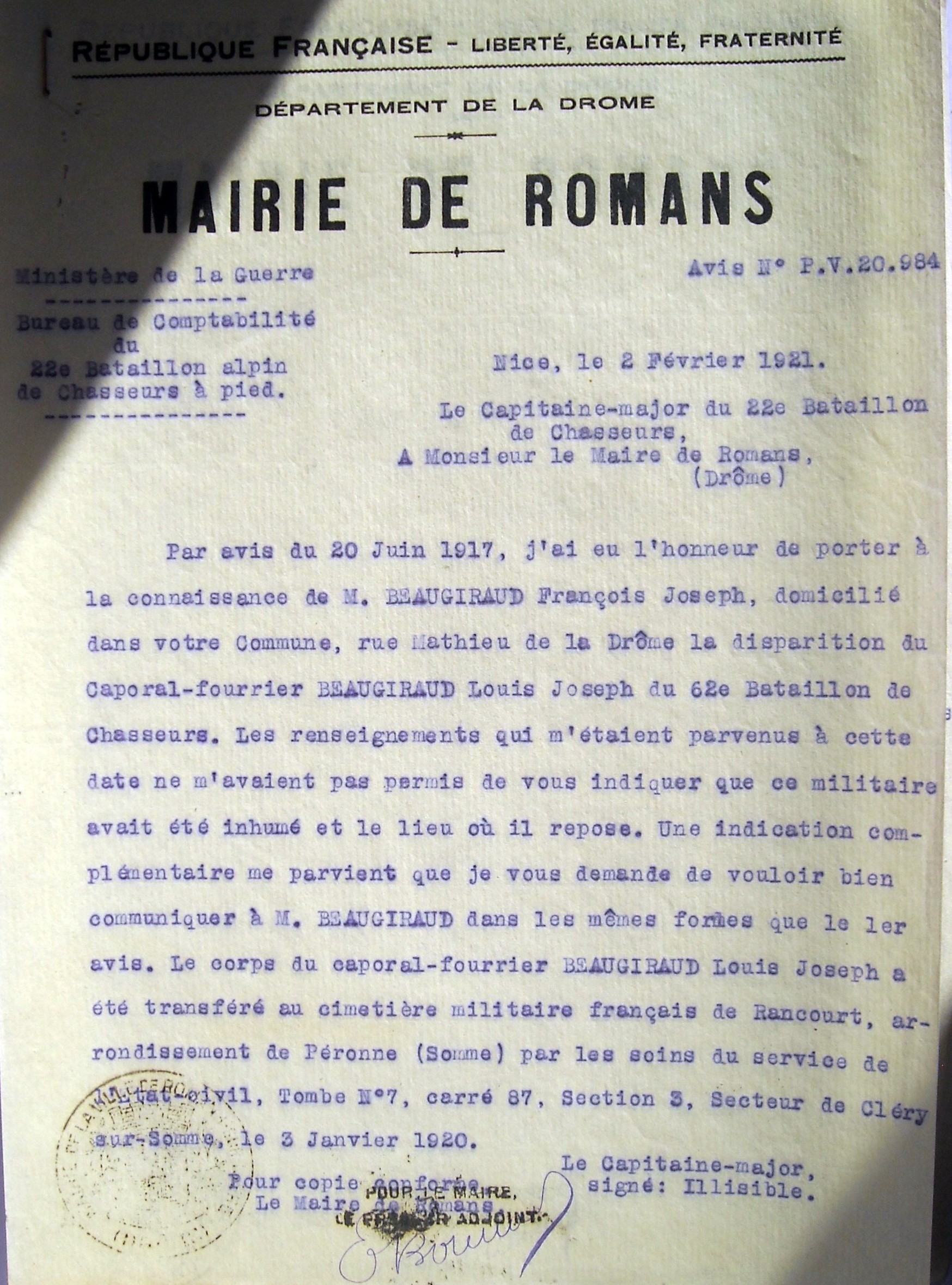 L’avis de décès a été envoyé le 20 juin 1917 à M. François Joseph Beaugiraud domicilié rue Mathieu de la Drôme à Romans, Drôme..