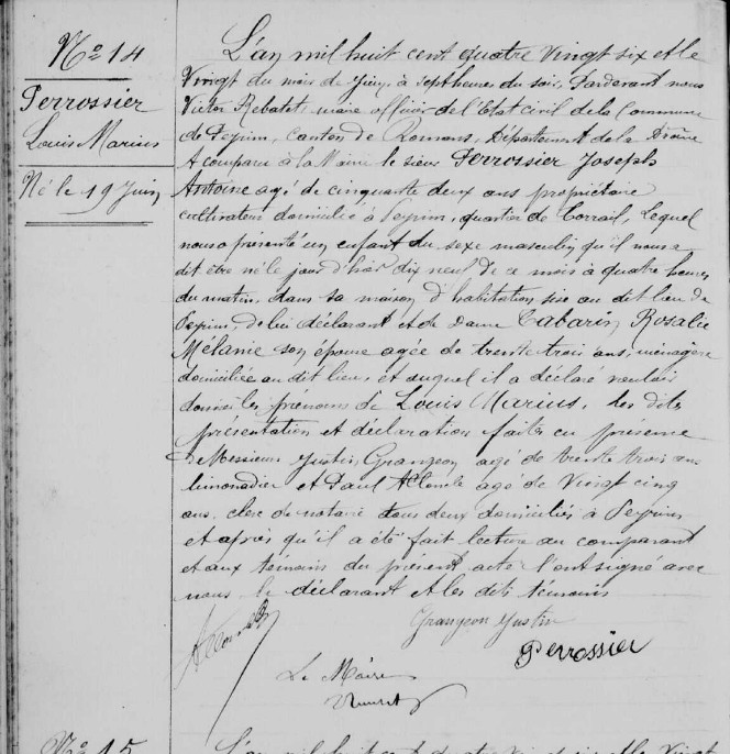 Louis Marius Perrossier est né le 19 juin 1886 à Peyrins, Drôme, au domicile de ses parents, de Joseph Antoine Perrossier, âgé de 52 ans, propriétaire cultivateur, et de Rosalie Mélanie Tabarin, âgée de 33 ans, ménagère, domiciliés quartier de Torrail à Peyrins, Drôme.
