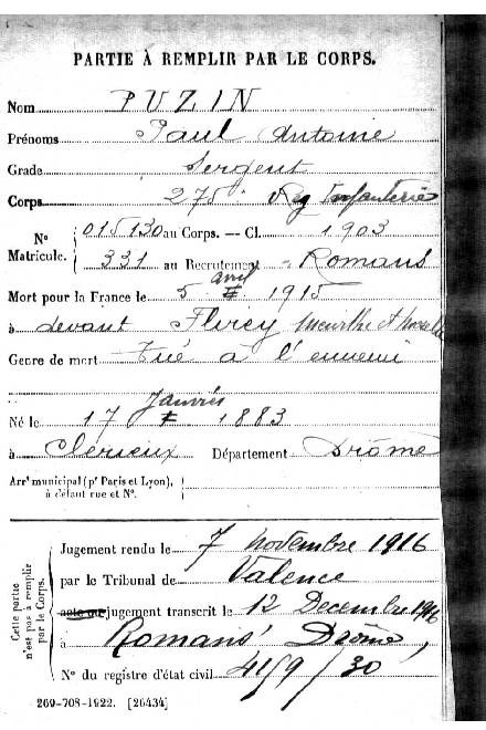 - Paul Antoine Puzin, Mort pour la France le 5 avril 1915