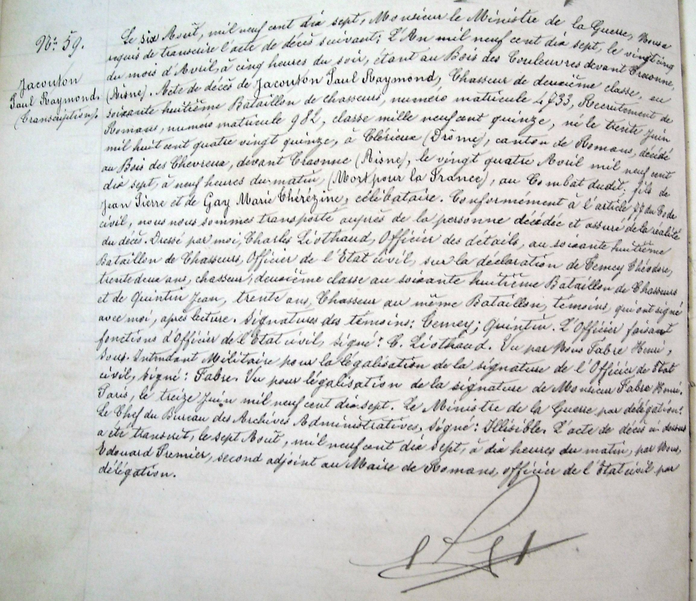L’avis de décès a été envoyé le 5 mai 1917 à M. Jacouton, son père, domicilié quartier de la Monnaie à Romans, Drôme. Le décès a été inscrit sur les registres de décès de Romans, Drôme : transcription 1917/59 du 7 août 1917.
