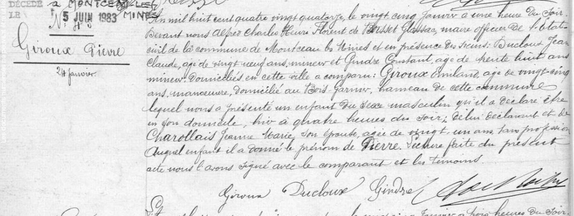 Pierre Giroux est né le 24 janvier 1894 à Montceau-les-Mines, Saône-et-Loire, au domicile de ses parents, de Emile Giroux, âgé de 25 ans, manoeuvre, et de Jeanne Marie Charollais, âgée de 21 ans, sans profession, domiciliés au Bois Garnier, Montceau-les-Mines, Saône-et-Loire.