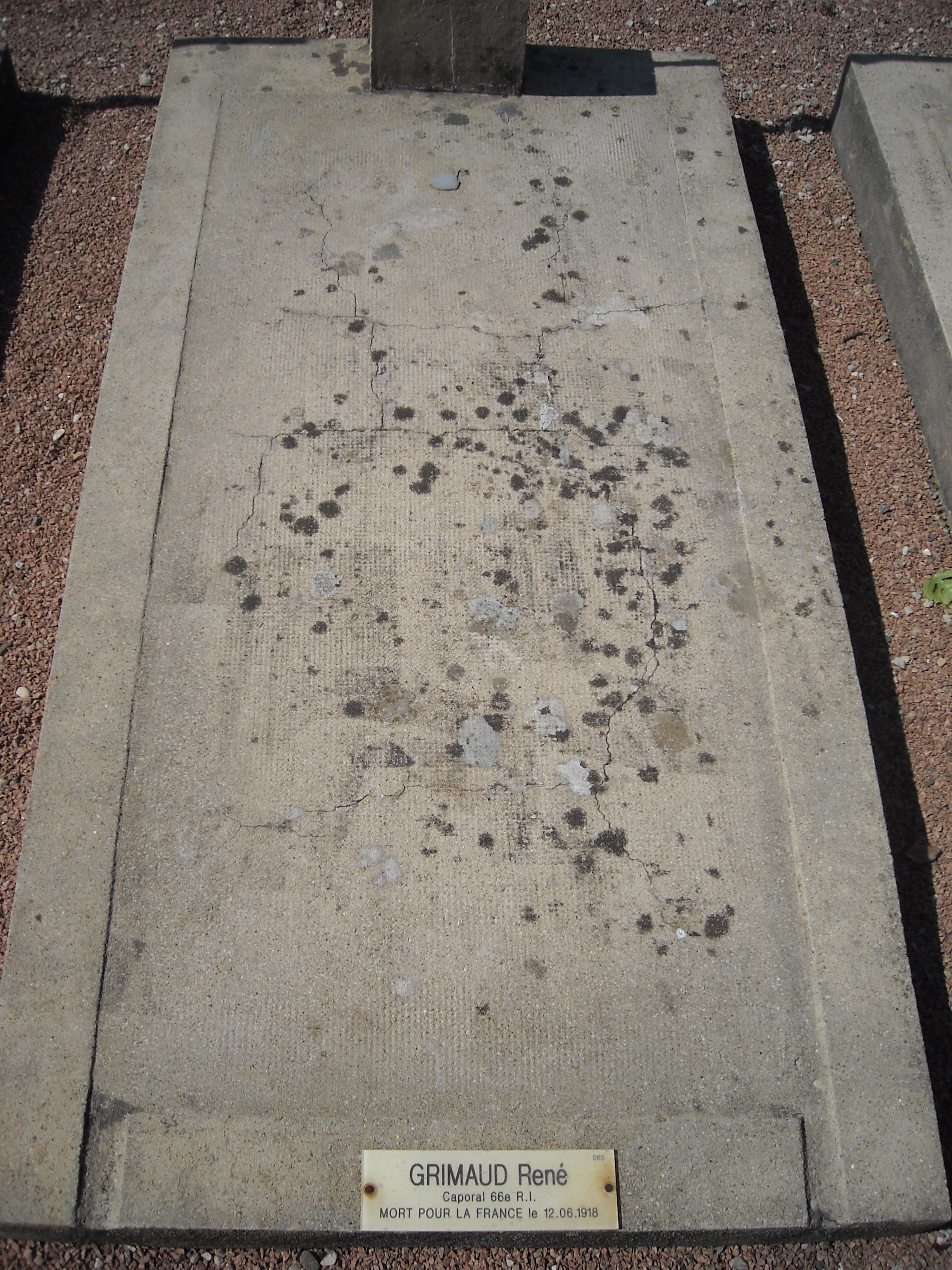 La plaque de sa tombe au Carré Militaire de Romans, Drôme, porte l’inscription “Grimaud René, Caporal 66e R.I., 12.06.1918”.