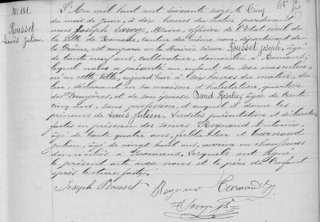 Louis Julien Rousset est né le 5 juin 1876 à Romans, Drôme, au domicile de ses parents, de Joseph Rousset, âgé de 39 ans, cultivateur, et de Rosalie Dard, âgée de 35 ans, sans profession, domiciliés quartier des Bruyères à Romans, Drôme.