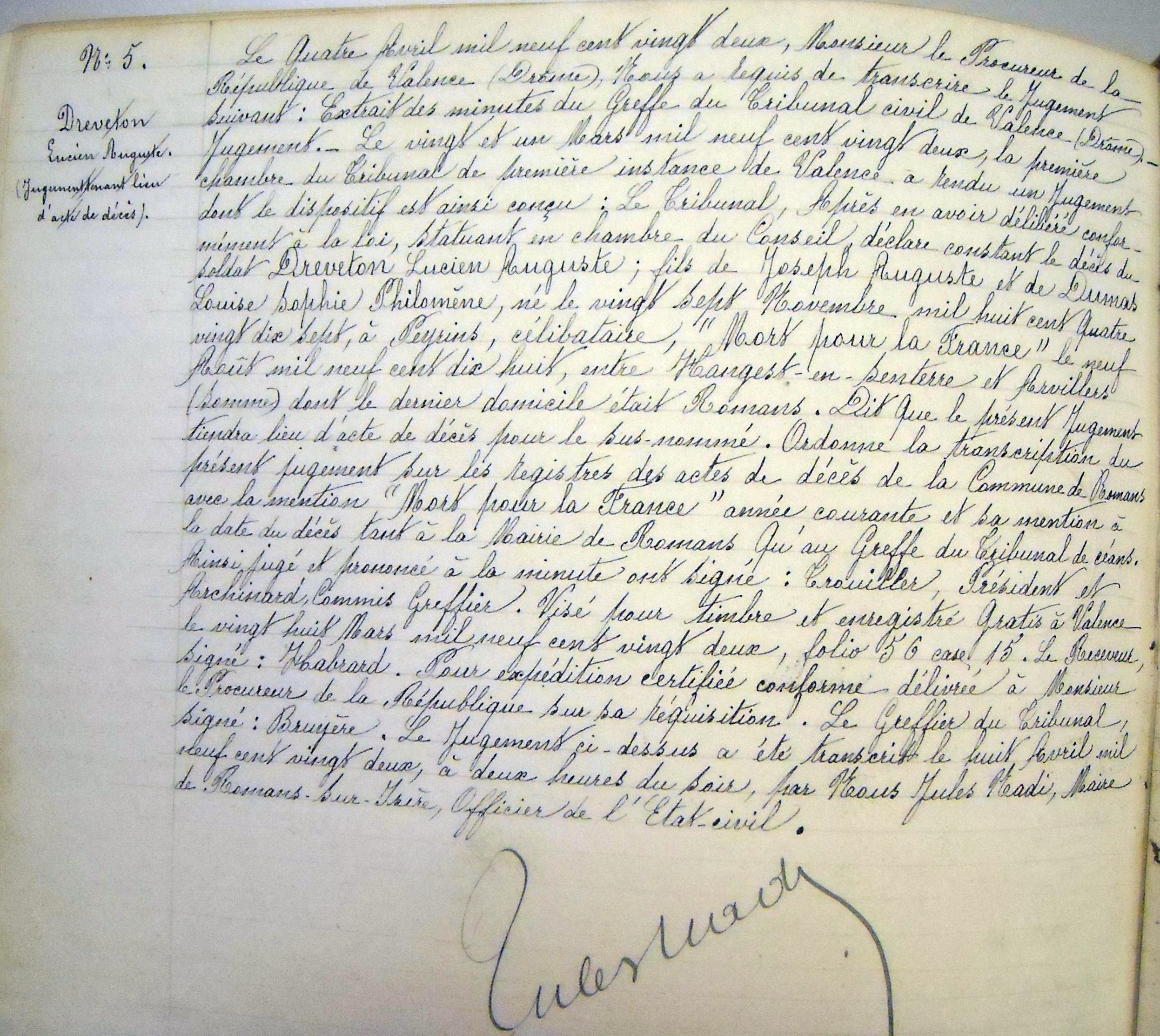 Le décès a été inscrit sur les registres de décès de Romans, Drôme : mention marginale 1918/303bis, jugement tenant lieu d’acte de décès 1922/5 du 8 avril 1922.